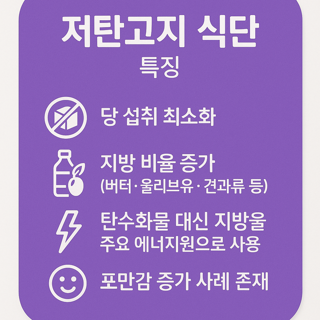 저탄고지는 탄수화물 섭취를 크게 줄이고, 지방과 단백질을 에너지원으로 사용하는 식단 방식이다. 탄수화물 의존도가 줄어들면서 체내 에너지 공급 방식이 변화하고, 일부 사람들은 포만감 증가와 체중 감소 경험을 말하기도 한다.